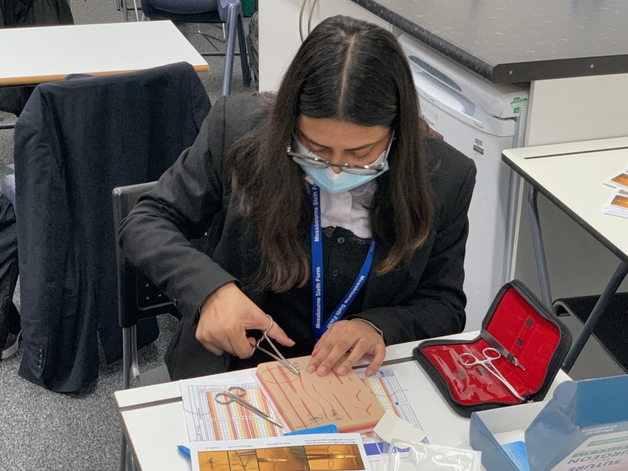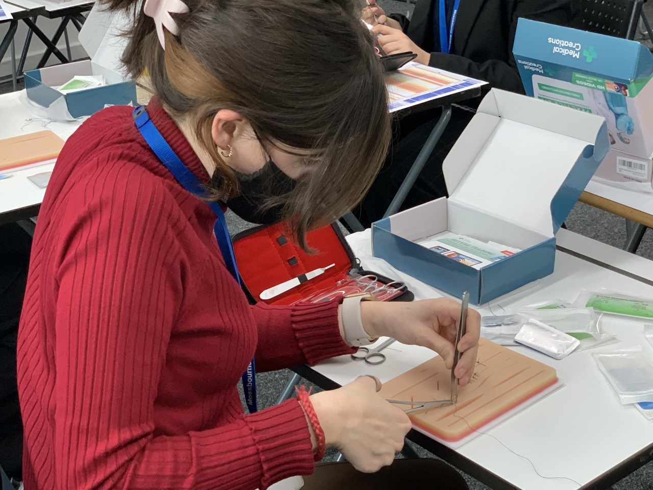 The session involved a guest lecture from Dr Monks, followed by opportunities for the budding medics to try their hands at some practical activities. Students completed a suturing station for half an hour and a diagnostics circuit which included looking into peak-flow lung capacity, oxygen saturation, blood pressure, how to use a stethoscope and digital thermometers.